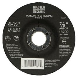 Master Mechanic, 4-1/2" x 1/4" x 7/8" Arbor, Masonry Depressed Center Grinding Wheel, Double Reinforced With Industrial Grit & Glue For Increased Life & Durability, Superior Friability Allows Wheel To Break Down Quickly, Consistently Exposing New Grain For Increased Sharpness & Longer Life, For Low Angle & Vertical Grinding, Max RPM Rating 13,300.